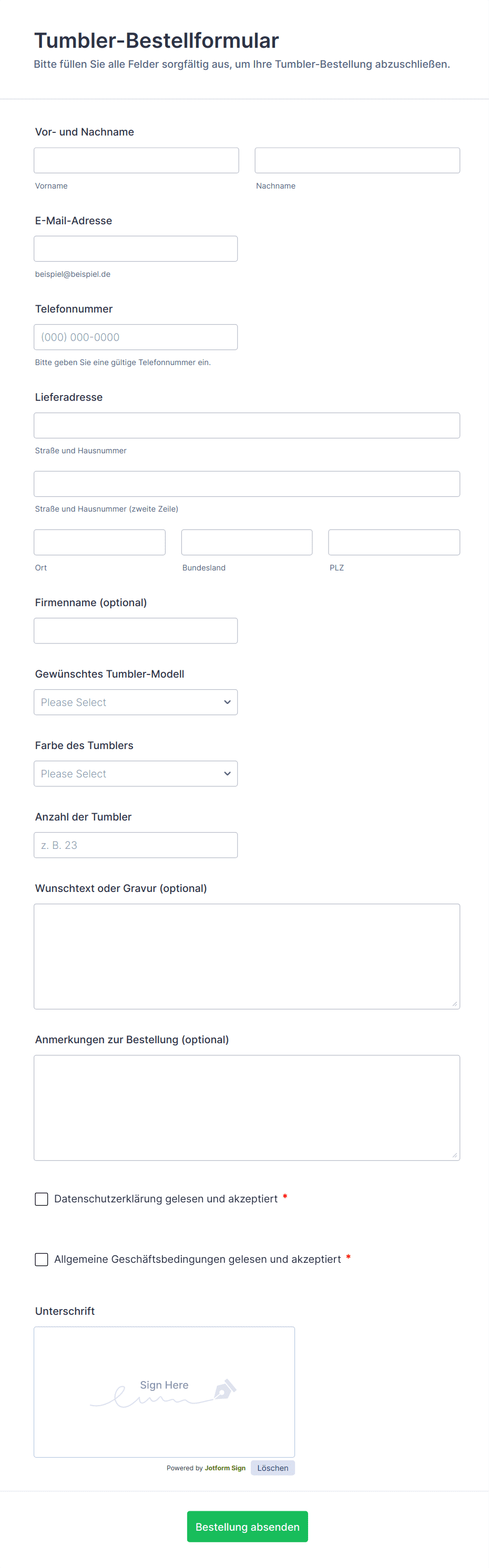 Typische Felder umfassen Kundenname, Kontaktinformationen, Produktauswahl, Menge, Zahlungsdetails und Lieferadresse (falls zutreffend).