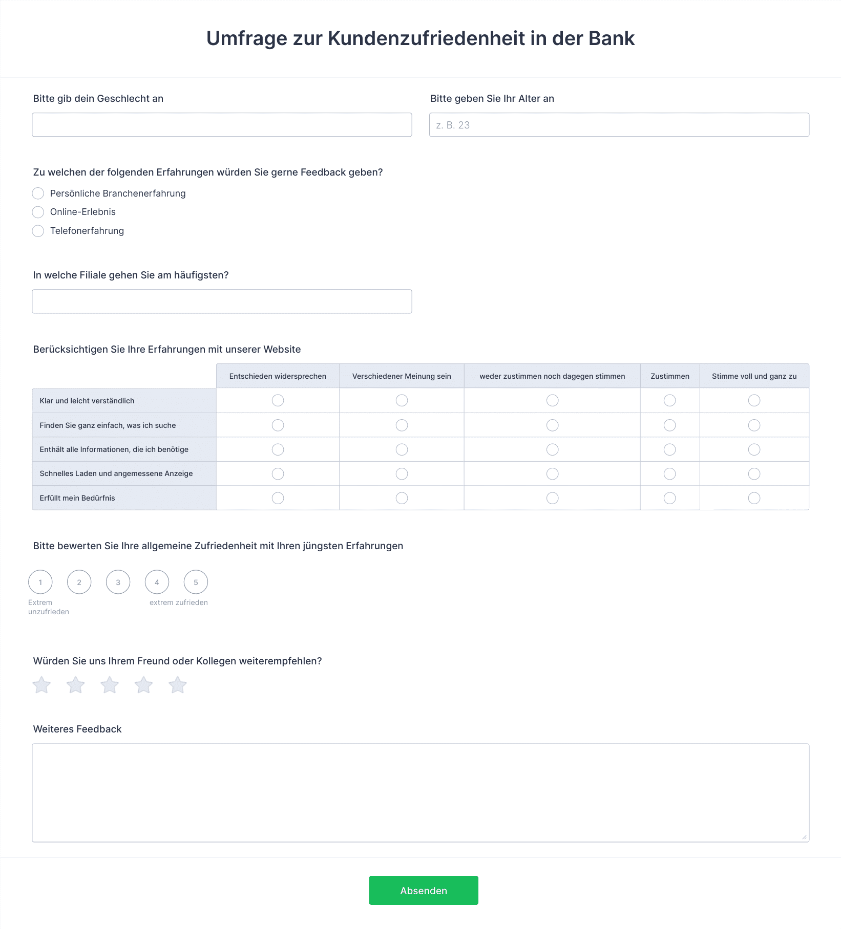 • Kundenzufriedenheitsumfragen: Sammeln Sie Feedback zu Produkten, Dienstleistungen oder Erfahrungen, um das Angebot zu verbessern.