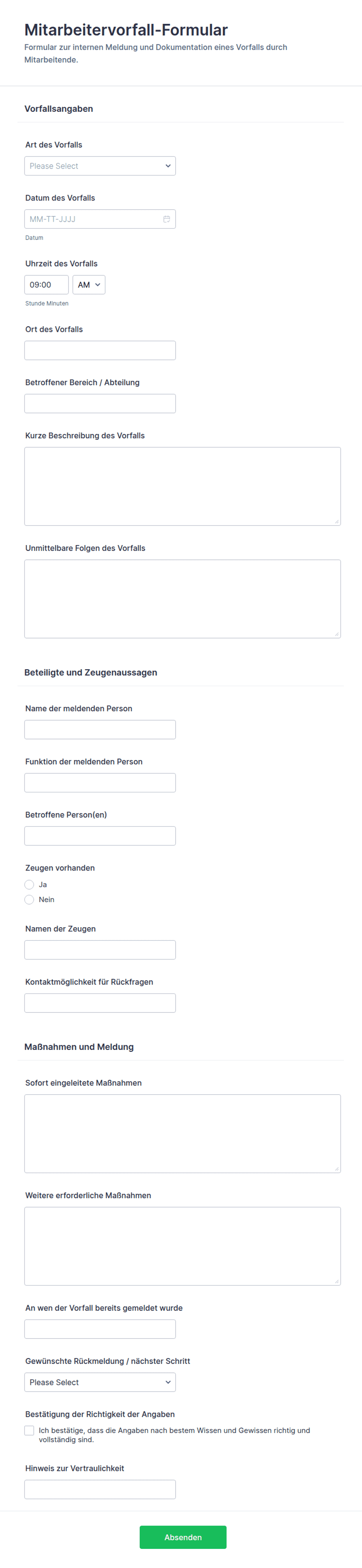 In der Regel füllen der betroffene Mitarbeiter, ein Zeuge oder ein Vorgesetzter bzw. Manager das Formular aus — je nach Richtlinien der Organisation und Art des Vorfalls.