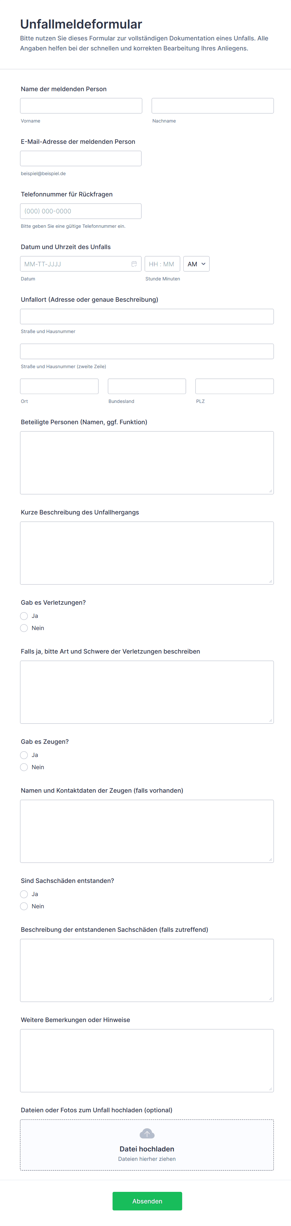 Ein Vorfallsmeldeformular ist ein strukturiertes Dokument zur Erfassung von Details über unerwartete Ereignisse, Unfälle oder Beinahe-Unfälle in verschiedenen Umgebungen. Es hilft Organisationen zu dokumentieren, was passiert ist, wer beteiligt war und welche Maßnahmen ergriffen wurden.