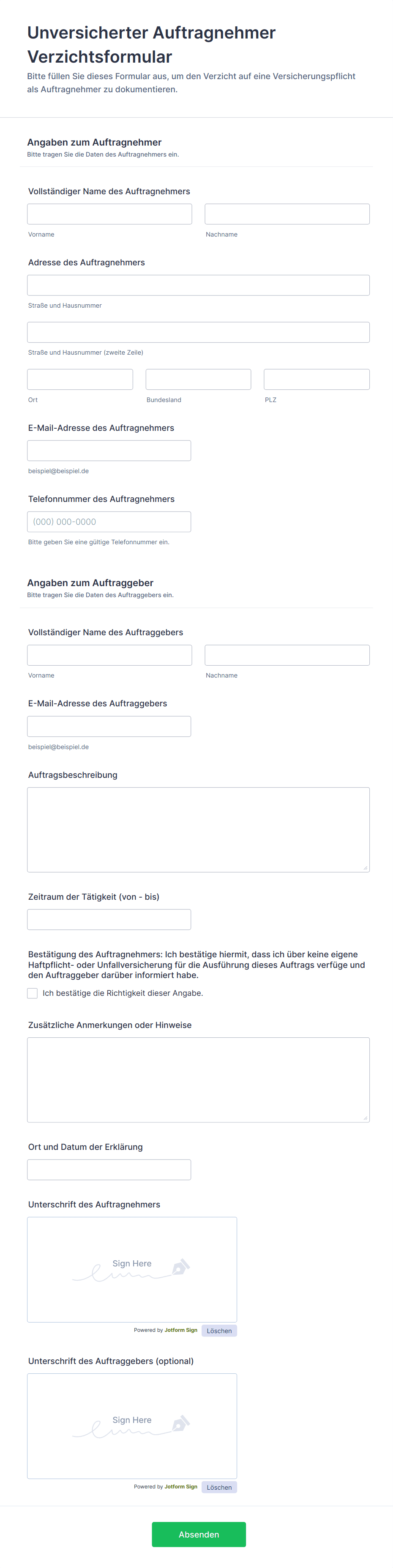 Mit Jotform wird das Erstellen und Verwalten von Haftungsausschlüssen zu einem nahtlosen, effizienten Prozess. Mit dem No-Code Drag-and-Drop Formulargenerator von Jotform können Benutzer schnell Haftungsausschlüsse anpassen, Vorlagen oder Formulare ganz neu erstellen und wichtige Felder wie Teilnehmerinformationen, digitale Signaturen und Zustimmungs-Checkboxen hinzufügen. Die automatische Datenspeicherung, Echtzeitbenachrichtigungen und die Integration mit anderen Tools optimieren die Erfassung und Verwaltung von unterzeichneten Verzichtserklärungen. Ganz gleich, ob Sie Kleinunternehmer, Veranstaltungsorganisator oder Gesundheitsdienstleister sind – mit Jotform können Sie online rechtsgültige Haftungsausschlüsse einholen, Papierarbeit reduzieren und Compliance mühelos sicherstellen.