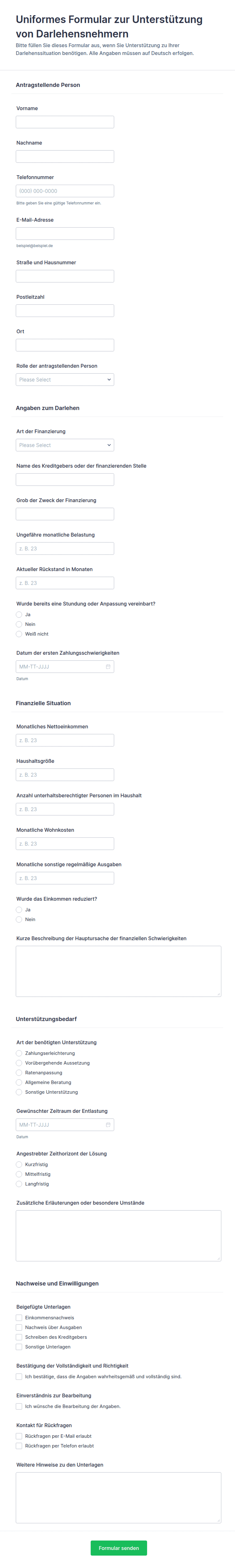 Ja, Formulare können für Privatkredite, Unternehmenskredite, Hypotheken, Autokredite, Studienkredite und Refinanzierungen angepasst werden – jeweils mit spezifischen Feldern und Dokumentationen.