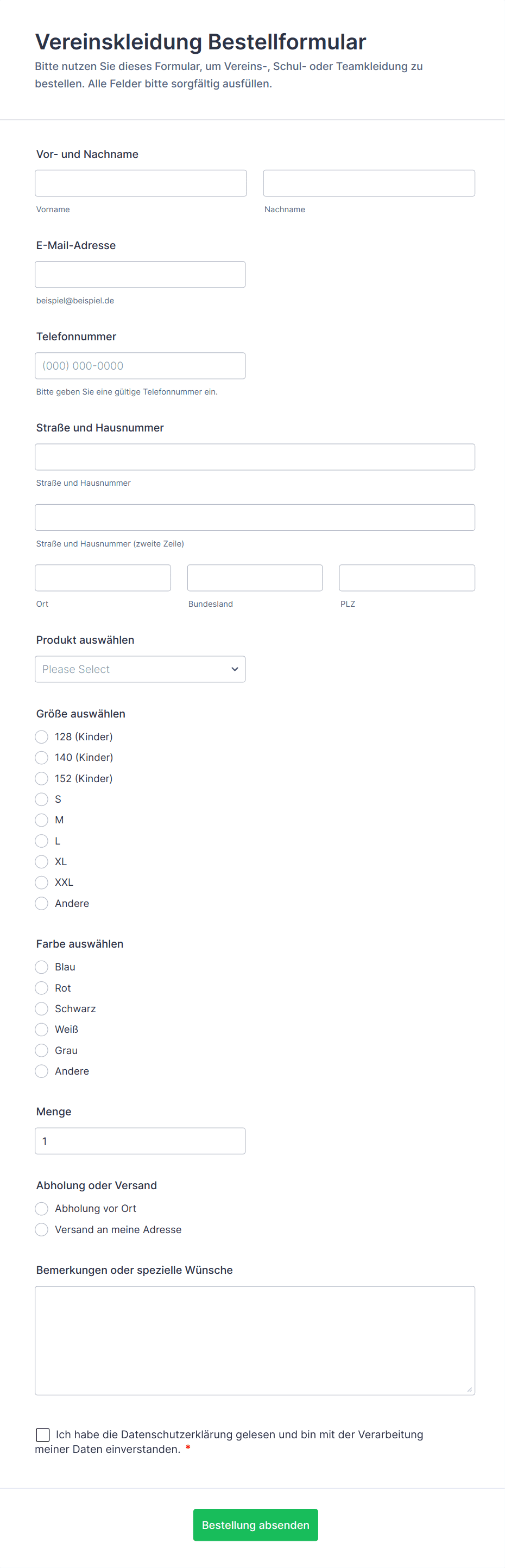 Typische Felder umfassen Kundenname, Kontaktdaten, Artikelart, Größe, Farbe, Menge, Anpassungsoptionen und Zahlungsinformationen.