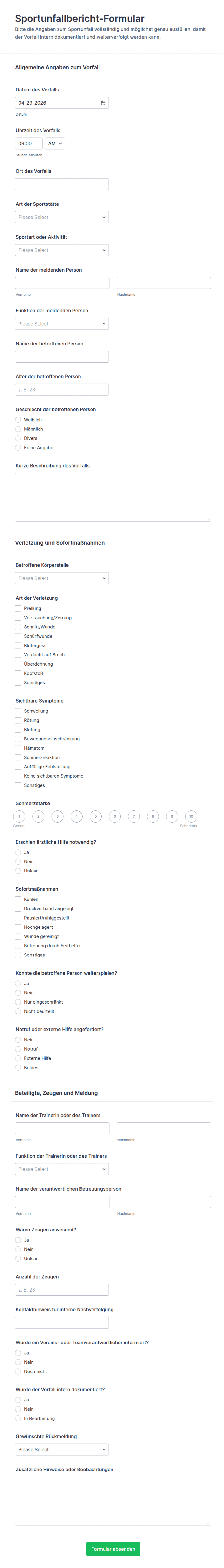 Dokumentieren Sie Sportunfälle einheitlich mit dem Sportunfallbericht-Formular und unterstützen Sie Vereine, Schulen und Sportanbieter bei Datenerfassung, interner Nachverfolgung und klaren Zuständigkeiten.