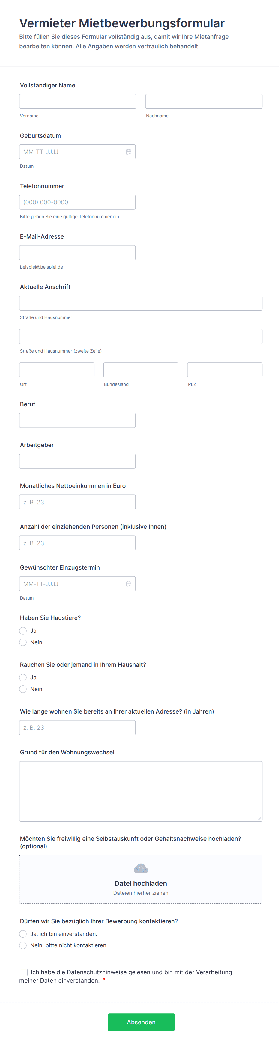 Zu den wesentlichen Informationen gehören der Name des Bewerbers, seine Kontaktdaten, Angaben zu Beschäftigung und Einkommen, Miethistorie, Nachweise und die Einwilligung zu Hintergrund- oder Bonitätsprüfungen. Je nach Art der Immobilie können zusätzliche Felder hinzugefügt werden.