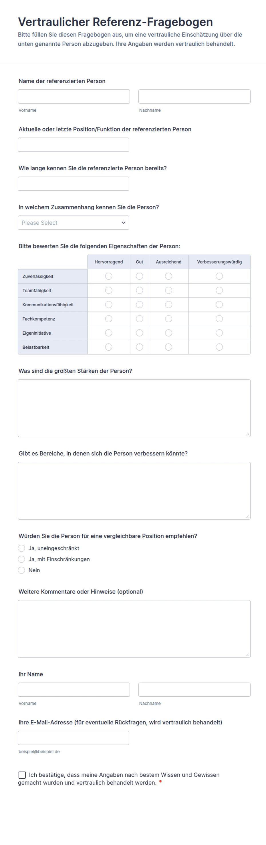 - Professionelle Referenzformulare erfassen die Arbeitsbeziehung, den Rollenkontext, Leistungsfeedback, Stärken, Zuverlässigkeit und die Eignung für die Rolle.