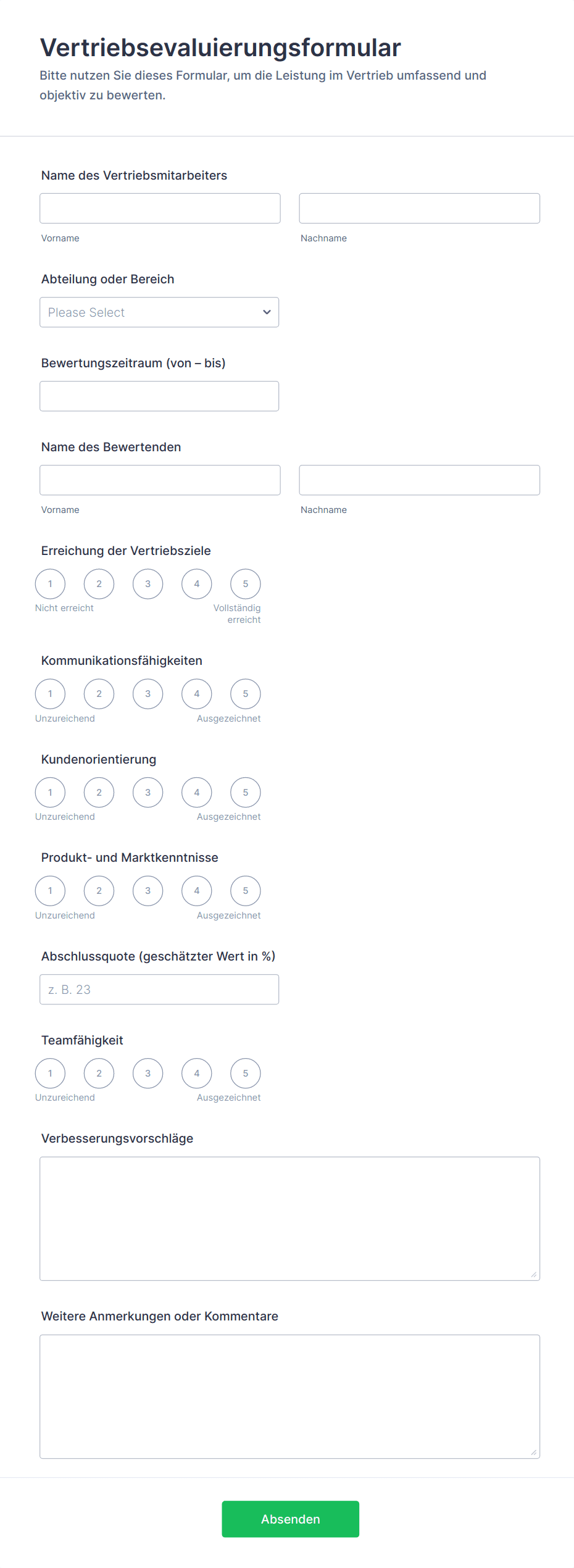 Gute Mitarbeiterbeurteilungsformulare enthalten in der Regel Informationen zur Identifizierung des Mitarbeiters, einschließlich Name, Position, Abteilung, Beurteilungszeitraum, Team etc. Anschließend werden die Ziele, Zielvorgaben oder Leistungsindikatoren des Mitarbeiters aufgelistet und es wird die Möglichkeit geboten, die Leistung des Mitarbeiters in Bezug auf jeden einzelnen Punkt zu bewerten.