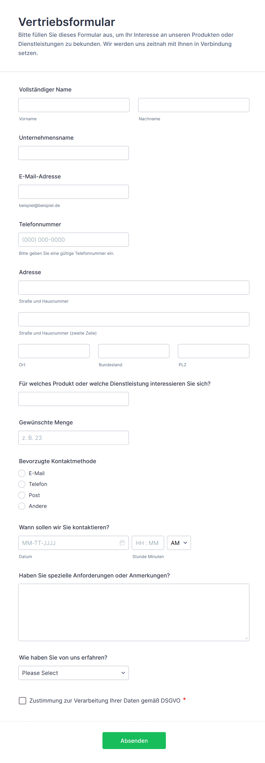 Welche Informationen Sie erfassen, hängt von Ihren Zielen ab. Zu den gängigen Feldern gehören jedoch Name, E-Mail-Adresse, Telefonnummer, Unternehmen, Berufsbezeichnung sowie spezifische Fragen zu Ihrem Produkt oder Ihrer Dienstleistung.