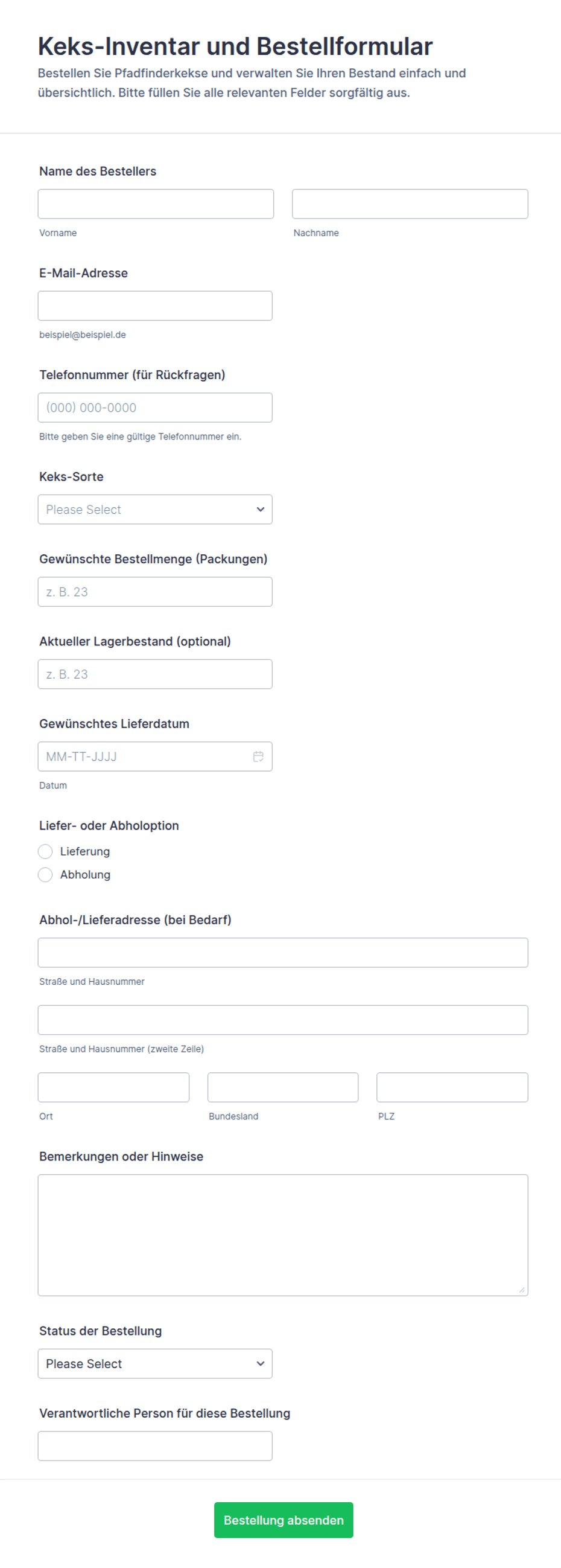 Wesentliche Felder umfassen Kundenkontaktdaten, Cookiesorten und -mengen, Liefer- oder Abholpräferenzen, Zahlungsoptionen und besondere Anweisungen oder Allergiehinweise.