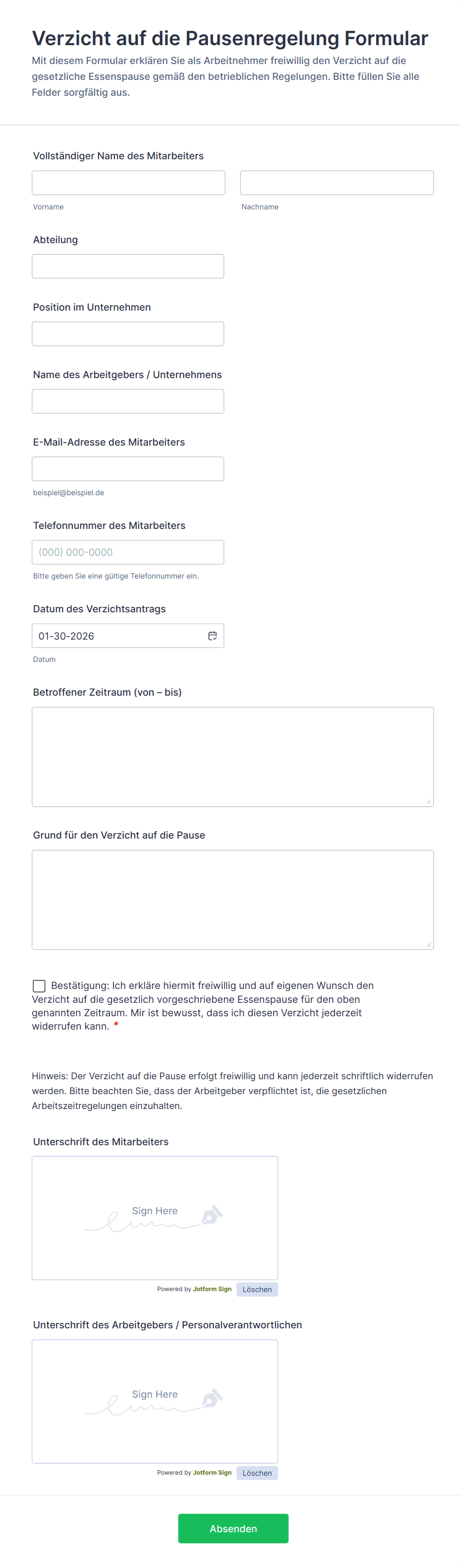 Mit dem Formular zur Beantragung von Minusstunden können Ihre Mitarbeiter eine Freistellung von der Arbeit beantragen. Mit dem Antragsformular für Minusstunden erhalten Sie die Details zu den Minusstundenanträgen Ihrer Mitarbeiter. Ganz gleich, ob Sie ein Büro oder eine Fabrik leiten, mit dem Antragsformular für Minusstunden können Ihre Mitarbeiter auf sichere und bequeme Weise Freizeit beantragen. Sie können es sogar so einrichten, dass genehmigte Anträge direkt in Ihren Kalender übernommen werden! Sie können dieses Formular in Sekundenschnelle einbetten und loslegen.Mit unserem kostenlosen Online-Formular für die Beantragung von Minusstunden können Sie ganz einfach Ihr Firmenlogo hinzufügen oder Schriftarten und Farben ändern, um es an Ihre Marke anzupassen. Wenn Sie zusätzliche Informationen erfassen möchten, fügen Sie dem Formular weitere Felder hinzu. Und wenn Sie das Formular auf Ihrem Handy oder Tablet verwenden möchten, nutzen Sie Jotform Mobile Formulare, um auch unterwegs Antworten zu erfassen! Wenn Sie das Formular selbst gestalten möchten, verwenden Sie unseren kostenlosen Formulargenerator, um die Formularfelder anzupassen, bedingte Logik hinzuzufügen oder den richtigen Auslöser zu wählen, damit das Formular erscheint. Sie können das Formular auch mit Ihren anderen Konten integrieren, um es optimal zu nutzen. Speichern Sie die Antworten in Ihrer bevorzugten Speicherplattform oder senden Sie sie sogar direkt an Ihren Kalender