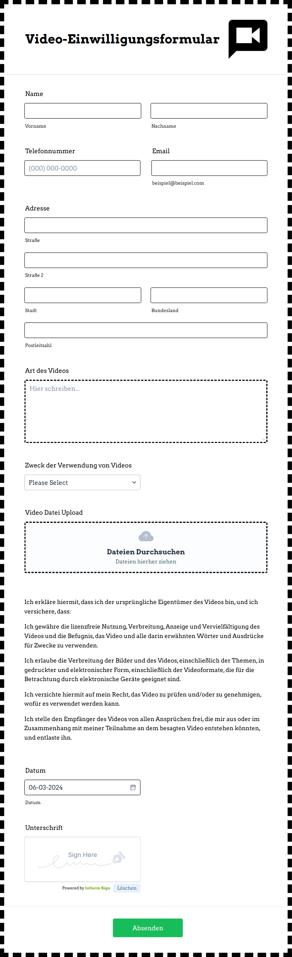 Die Formularvorlagen hier dienen nur zu Informationszwecken. Jotform bietet keine Rechts-, Finanz- oder sonstige Beratung an und impliziert nicht, dass die Formulare in allen oder bestimmten Rechtsordnungen rechtsgültig sind. Bevor Sie ein solches Formular verwenden, konsultieren Sie einen Anwalt und/oder andere zuständige Fachleute, um sicherzustellen, dass das Formular Ihren Anforderungen entspricht, rechtlich und anderweitig.