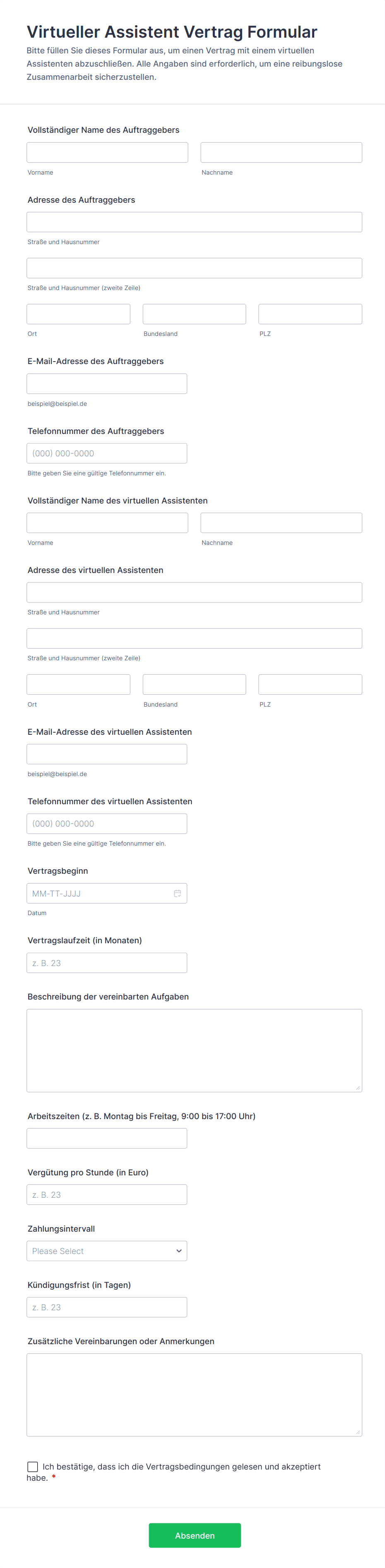 Erfassen Sie Vereinbarungen zwischen Auftraggeber und virtuellem Assistenten mit dem Virtueller-Assistent-Vertrag-Formular und halten Sie Konditionen für die Zusammenarbeit für eine saubere Daten­erfassung in Jotform fest.