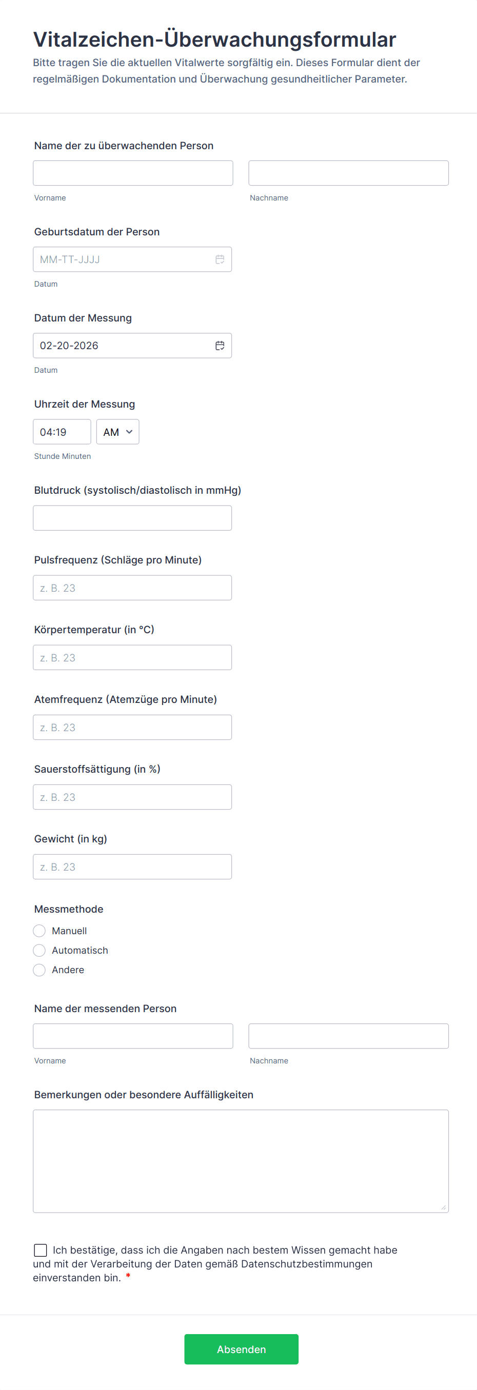 Eine Monitoring Formularvorlage ist ein vorgefertigtes digitales Formular, das zur systematischen Erfassung und Nachverfolgung von Daten über einen bestimmten Zeitraum für verschiedene Zwecke verwendet wird, wie z. B. Sicherheitsprüfungen, Geräteinspektionen oder Gesundheitsüberwachung.