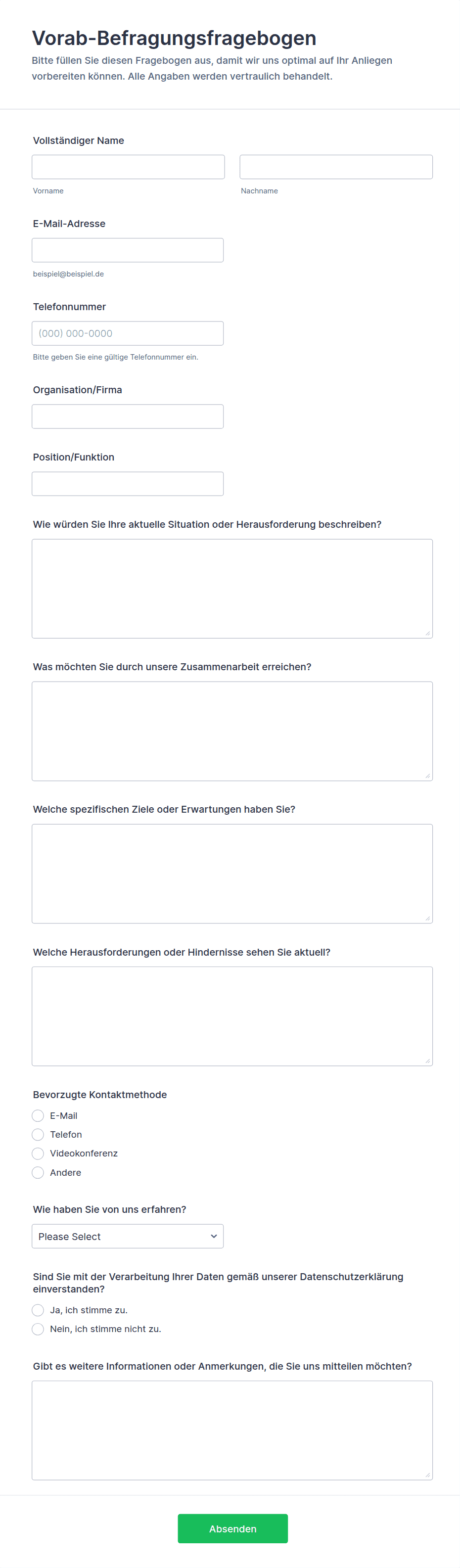 • Inhalt und Felder unterscheiden sich je nach Zielsetzung: So kann beispielsweise ein Fragebogen zur Gesundheitsvorsorge Angaben zur Krankengeschichte und Symptom-Checklisten enthalten, während ein Feedback Formular sich auf Zufriedenheitsbewertungen und offene Kommentare konzentriert.