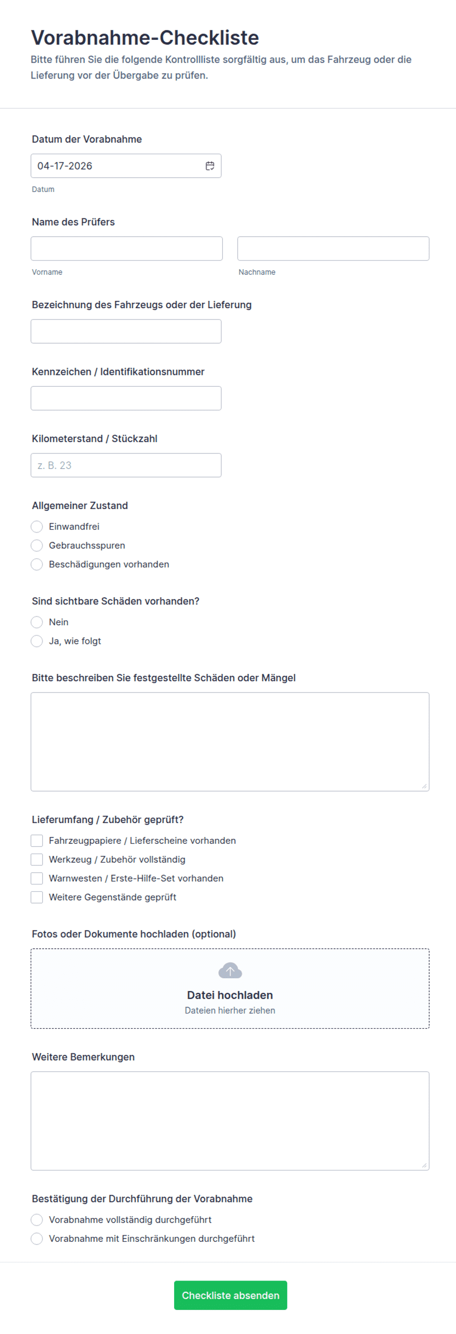 Übliche Felder umfassen Fahrzeugdetails, Inspektionsdatum, Checklistenpunkte (z. B. Bremsen, Beleuchtung, Reifen), Zustandsbewertungen, Fotos und Unterschriften.