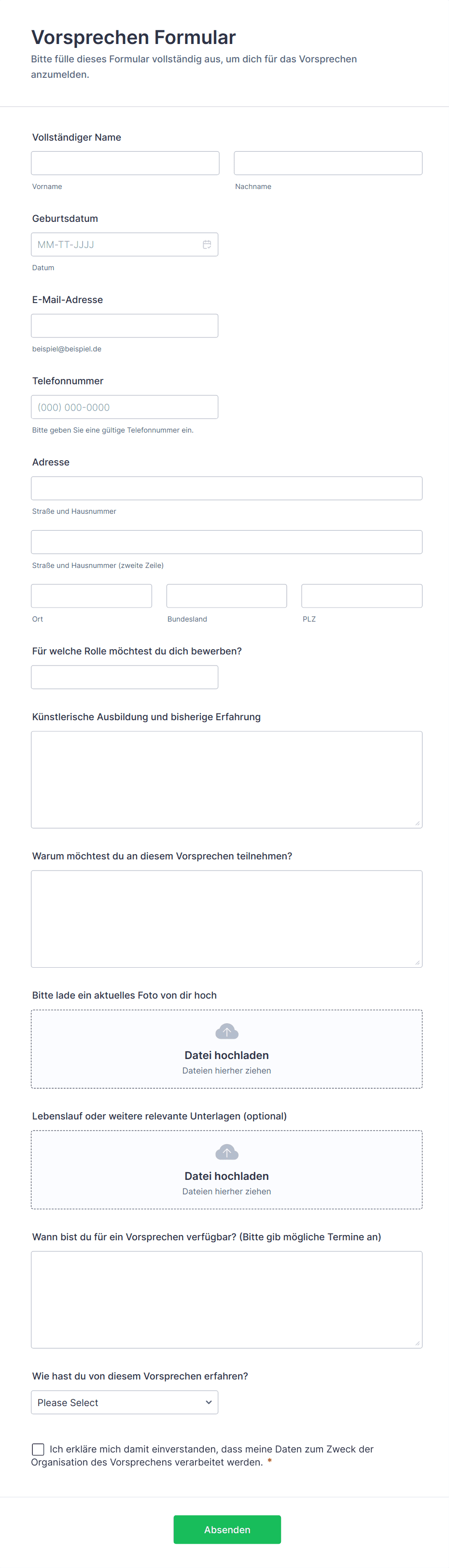 Ein Vorsprechen-Formular wird verwendet, um Anmeldungen und Bewerbungen für ein Vorsprechen einheitlich zu erfassen, damit Kontaktdaten, Rollenwünsche und organisatorische Angaben an einem Ort für die Datenerfassung vorliegen.