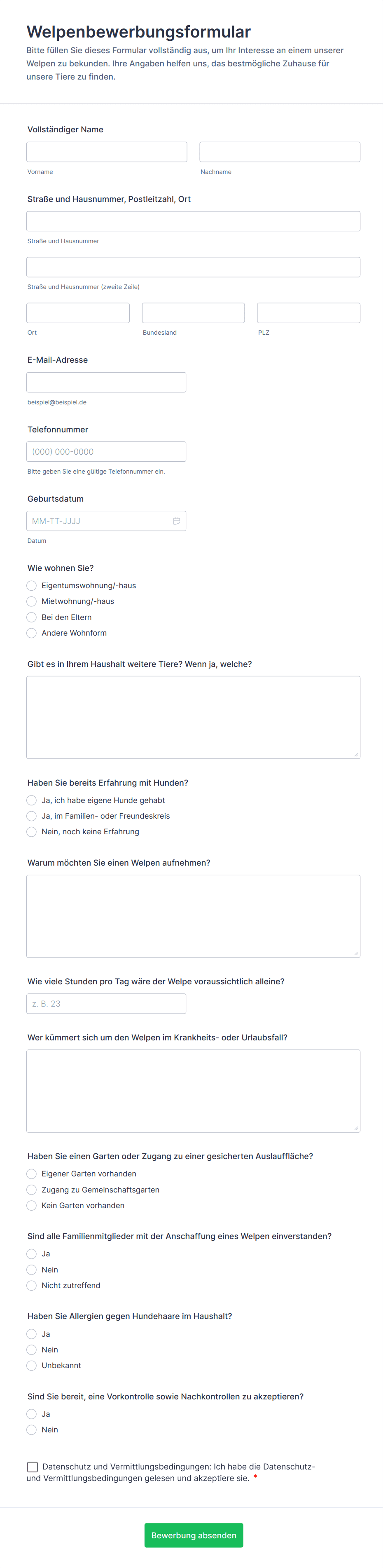 Zu den üblichen Angaben gehören persönliche Kontaktdaten, Informationen zum Haushalt, Erfahrungen mit der Haltung von Haustieren, Referenzen und spezifische Fragen zur Art der Bewerbung (Adoption, Pflege, ehrenamtliche Tätigkeit oder Abgabe).