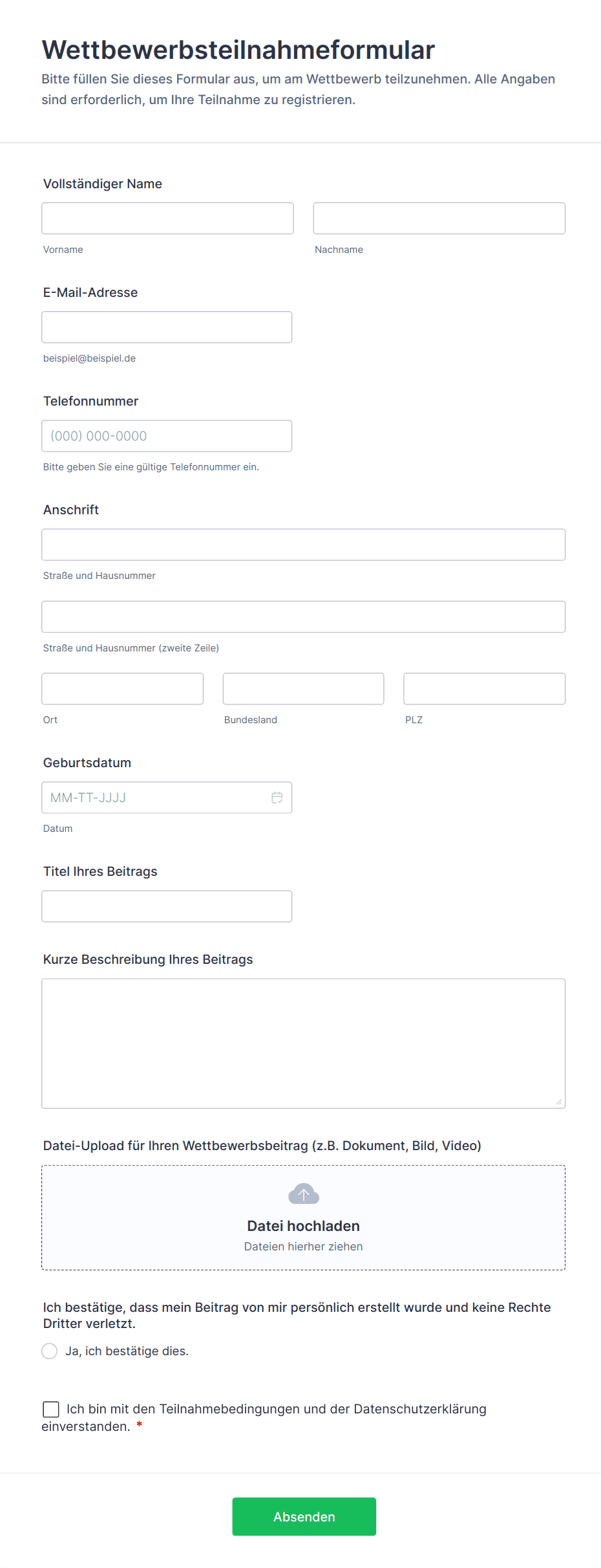 Wettbewerbsanmeldeformulare sind spezielle Online-Formulare, die dazu dienen, Teilnehmerinformationen für eine Vielzahl von Wettbewerben, Gewinnspielen und Verlosungen zu erfassen. Diese Formulare optimieren den Prozess der Erfassung wichtiger Daten wie Namen, Kontaktinformationen, Teilnahmeberechtigungen und wettbewerbsspezifische Antworten wie kreative Beiträge oder Antworten auf Quizfragen. Ganz gleich, ob Sie einen Fotowettbewerb, einen Schreibwettbewerb, ein Gewinnspiel in den sozialen Medien oder einen Unternehmenswettbewerb veranstalten – mit Wettbewerbsanmeldeformularen können Organisatoren Anmeldungen effizient verwalten, die Einhaltung der Regeln sicherstellen und einen fairen und organisierten Auswahlprozess gewährleisten.