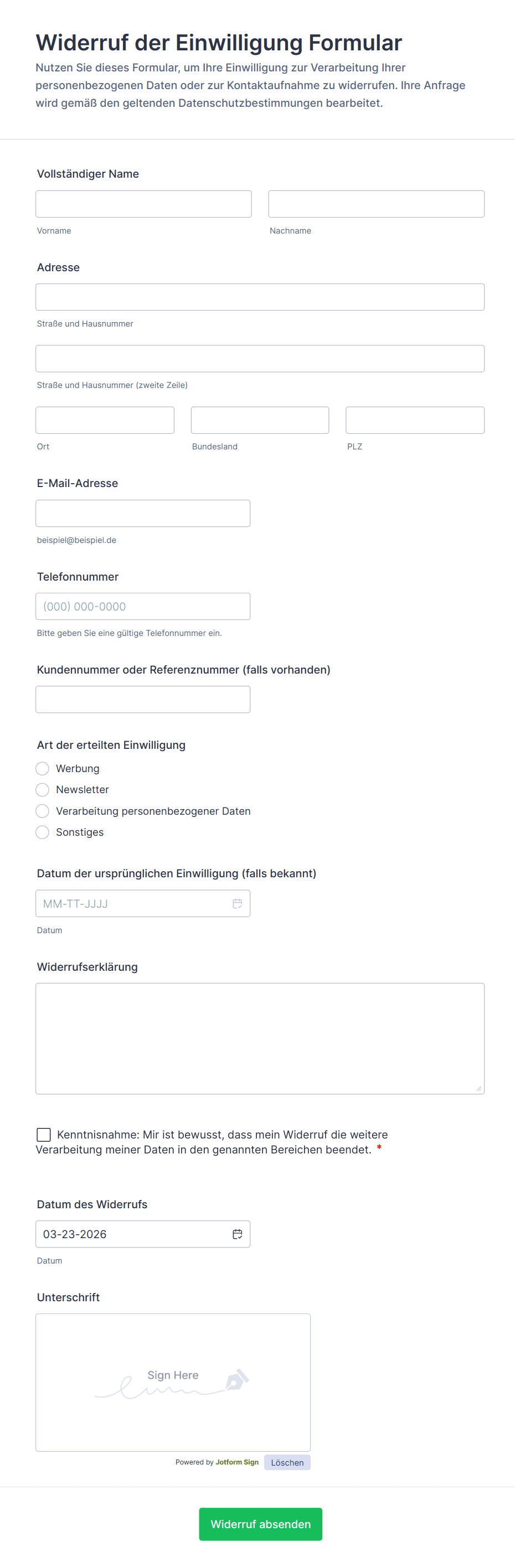 - Für medizinische oder Forschungsformulare sollten Abschnitte für bestimmte Verfahren, Widerrufsrechte und Datenschutzhinweise enthalten sein.