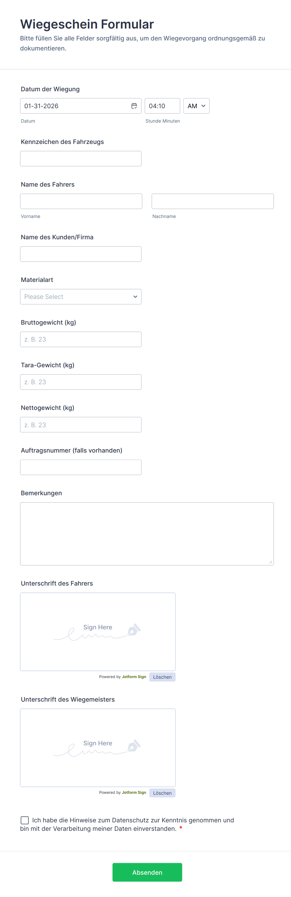 - Anwesenheitserfassung: Formulare können Mitarbeiternamen, Daten, Ein-/Ausstempelzeiten und Abwesenheitsgründe erfordern.