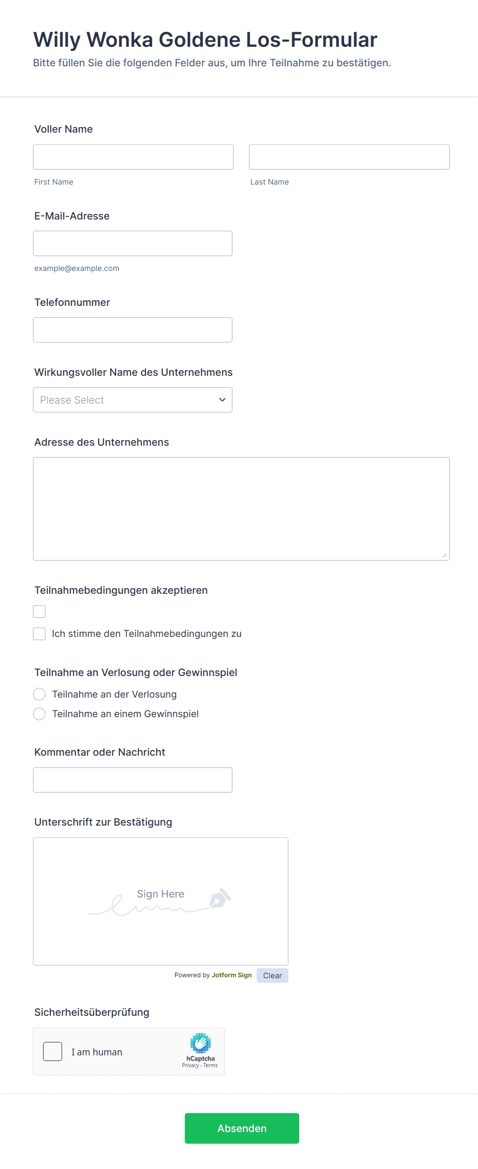 Erfassen Sie Gewinnspiel- und Verlosungsanmeldungen mit dem Willy Wonka Goldene Los-Formular, ideal für Unternehmen und Veranstalter, die Datenerfassung online bündeln und jede Formularantwort in Jotform zentral verwalten möchten.