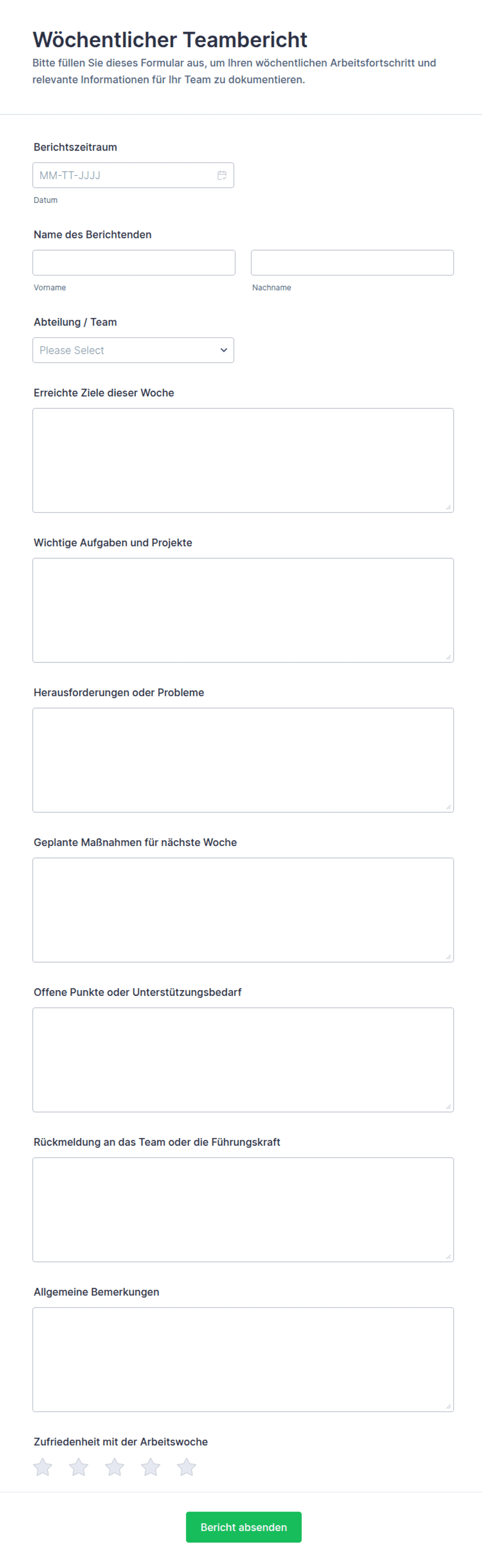 Je nach Anwendungsfall können Berichtsvorlagen Felder für Daten, Namen, Beschreibungen, Metriken, Anhänge, Signaturen sowie visuelle Elemente wie Diagramme oder Tabellen enthalten.