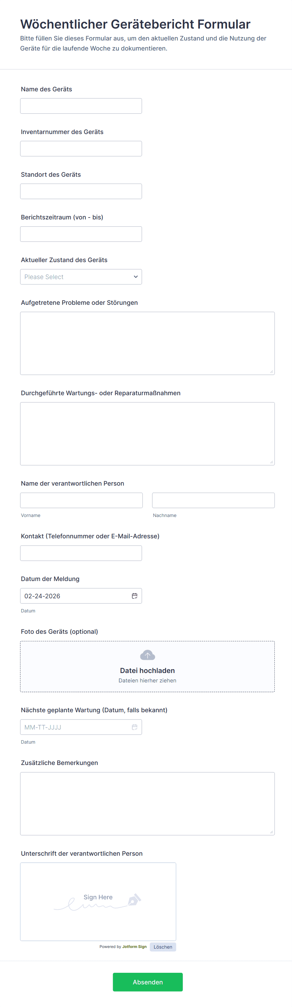 Erfassen Sie den Namen der Ausrüstung, die Asset-ID, die Seriennummer, den Standort und die Abteilung, damit die Wartung korrekt zugewiesen werden kann.