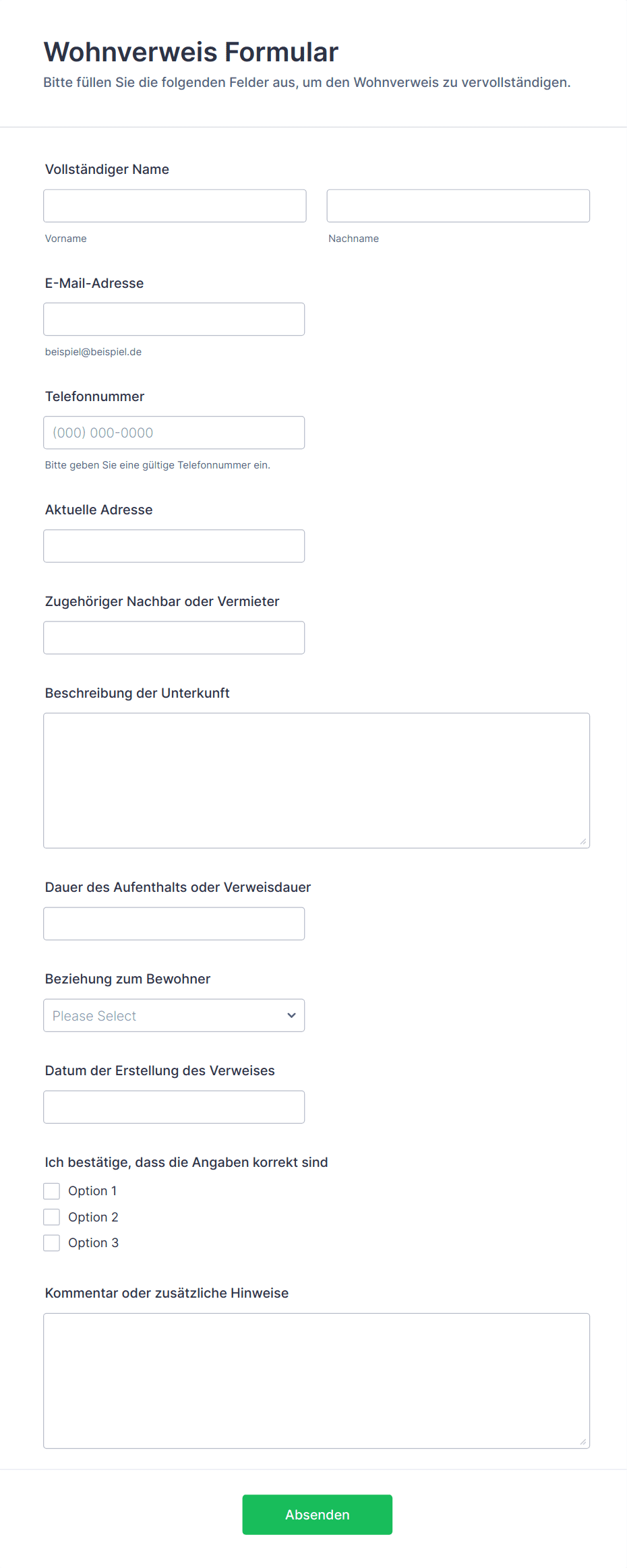 - Wartungsanfragen: Name des Mieters, Wohnungsnummer, Problembeschreibung, Dringlichkeitsstufe, Datei-Upload für Fotos.