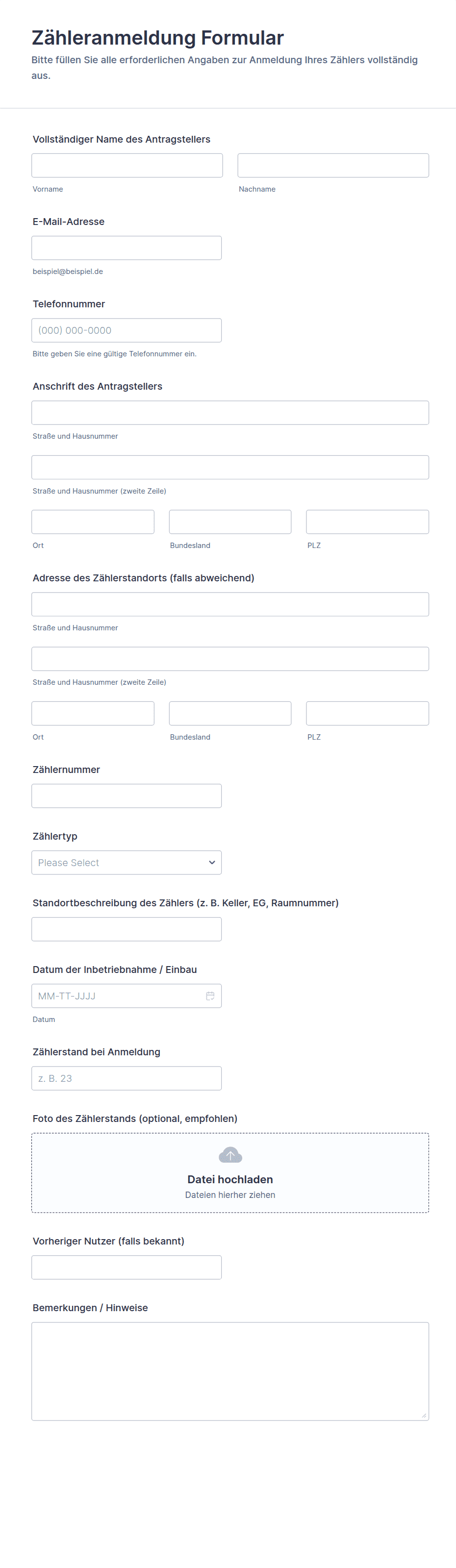 - Wartungsanfragen: Name des Mieters, Wohnungsnummer, Problembeschreibung, Dringlichkeitsstufe, Datei-Upload für Fotos.