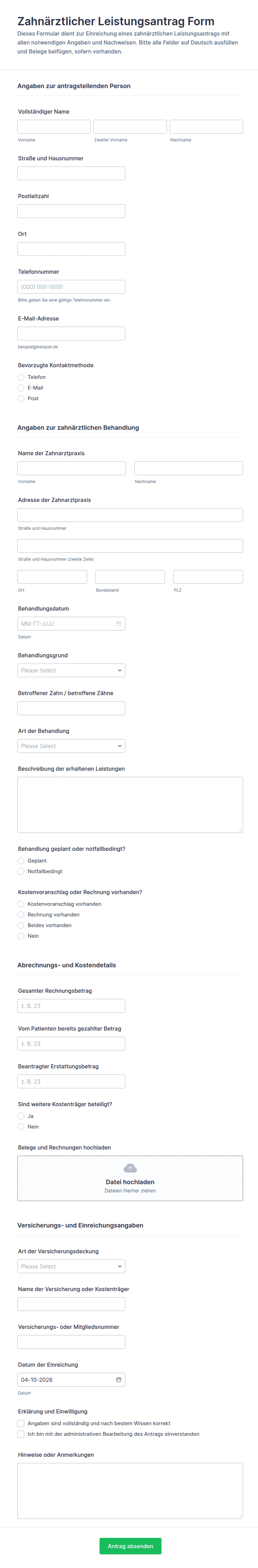 - Datei-Upload-Felder für Begleitdokumente (z. B. Quittungen, Fotos, Berichte)