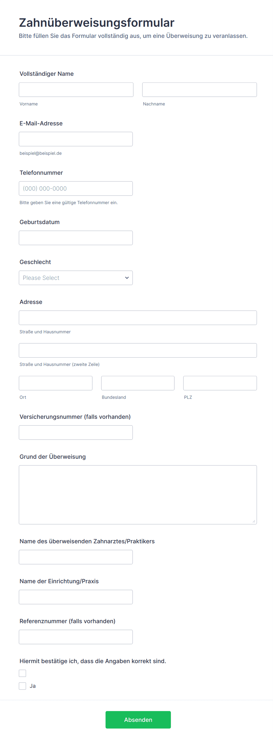 - Patientenüberweisungen: Gesundheitsdienstleister nutzen Überweisungsformulare, um Patienteninformationen zwischen Ärzten oder Fachärzten zu übermitteln. Diese Formulare erfordern häufig detaillierte Krankengeschichten, den Überweisungsgrund und Versicherungsinformationen.