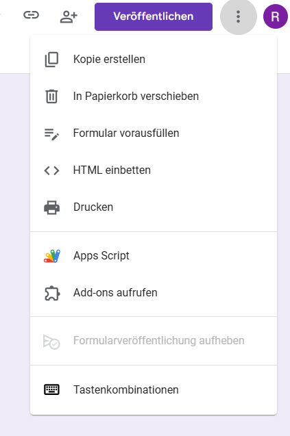 Nun fügen wir Formfacade hinzu. Beginnen Sie damit, die Add-ons im Dropdown-Menü mit den drei übereinander liegenden Punkten in der oberen rechten Ecke anzuklicken.