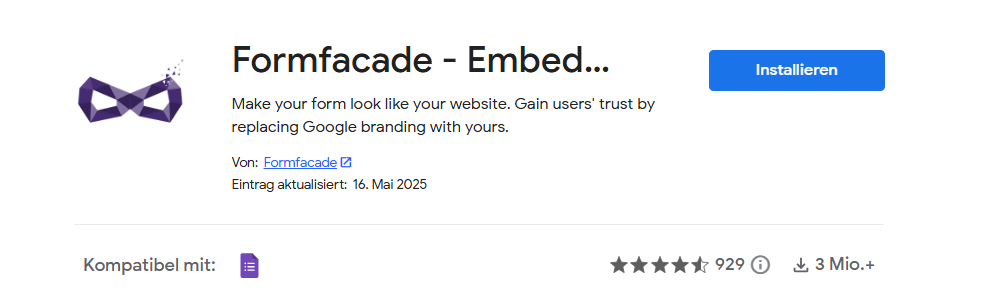 Sobald Sie das Marketplace-Dialogfeld sehen, suchen Sie nach Formfacade. Klicken Sie auf Formfacade und anschließend auf Installieren.