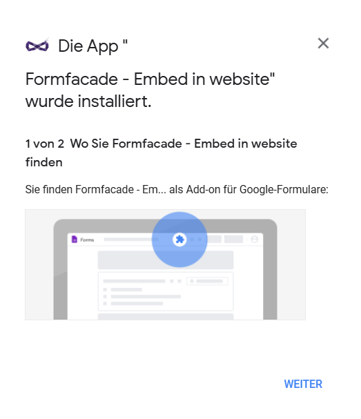 Akzeptieren Sie die Berechtigungsanfrage, indem Sie auf Weiter klicken und den Anweisungen folgen. Nachdem Formfacade installiert wurde, sehen Sie Fragen zur Konfiguration und Einbettung.