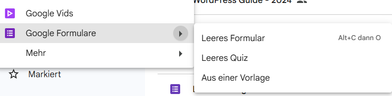 - Halten Sie den Mauszeiger über den Pfeil neben Google Formulare im Dropdown-Menü. Sie sehen drei Optionen: Leeres Formular, Leeres Quiz, oder Aus einer Vorlage.