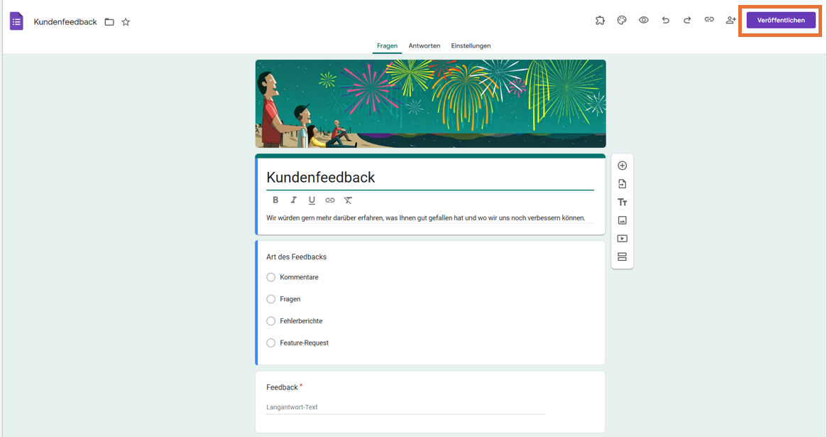 - Sobald Sie das Formular angepasst haben, klicken Sie in der oberen rechten Ecke auf Veröffentlichen, damit die Teilnehmer auf das Formular zugreifen können.