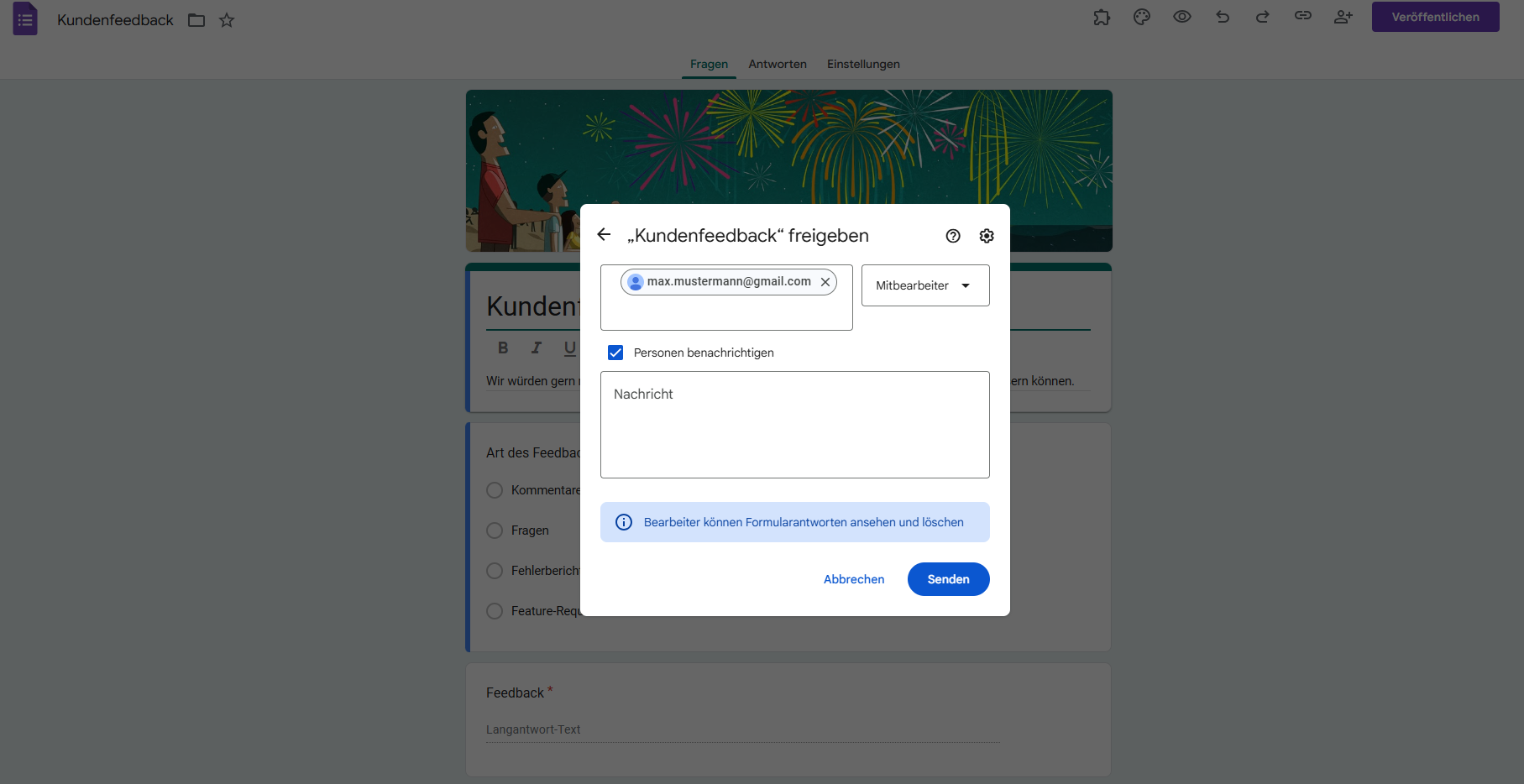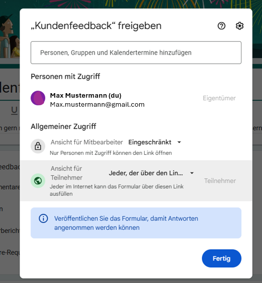 Sie haben diese Funktion jetzt aktiviert. Jedes Mal, wenn ein Teilnehmer ein Formular absendet, erhalten Sie eine Benachrichtigung im mit dem Formular verknüpften Gmail-Konto.