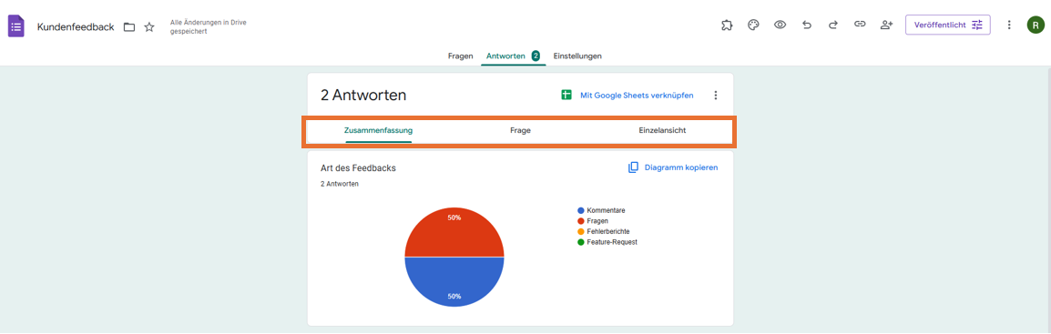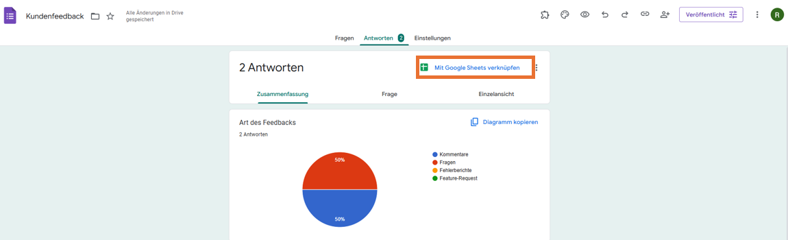 Wenn Sie die Formularantworten in einer Tabelle anzeigen und nachverfolgen möchten, können Sie Ihr Google-Formular einfach mit einem Google Sheet verbinden.