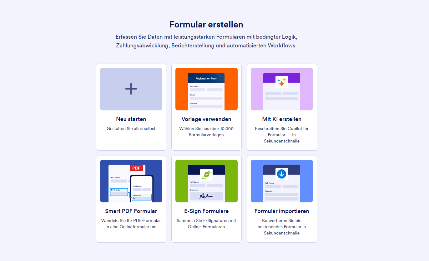 Die Jotform-Lösung zur Erstellung von Formularen ist mobilfreundlich und verfügt über die meisten Integrationen in der Branche. Nutzen Sie es, um Zahlungen einzuziehen, Workflows zu automatisieren, Leads zu erfassen und vieles mehr.