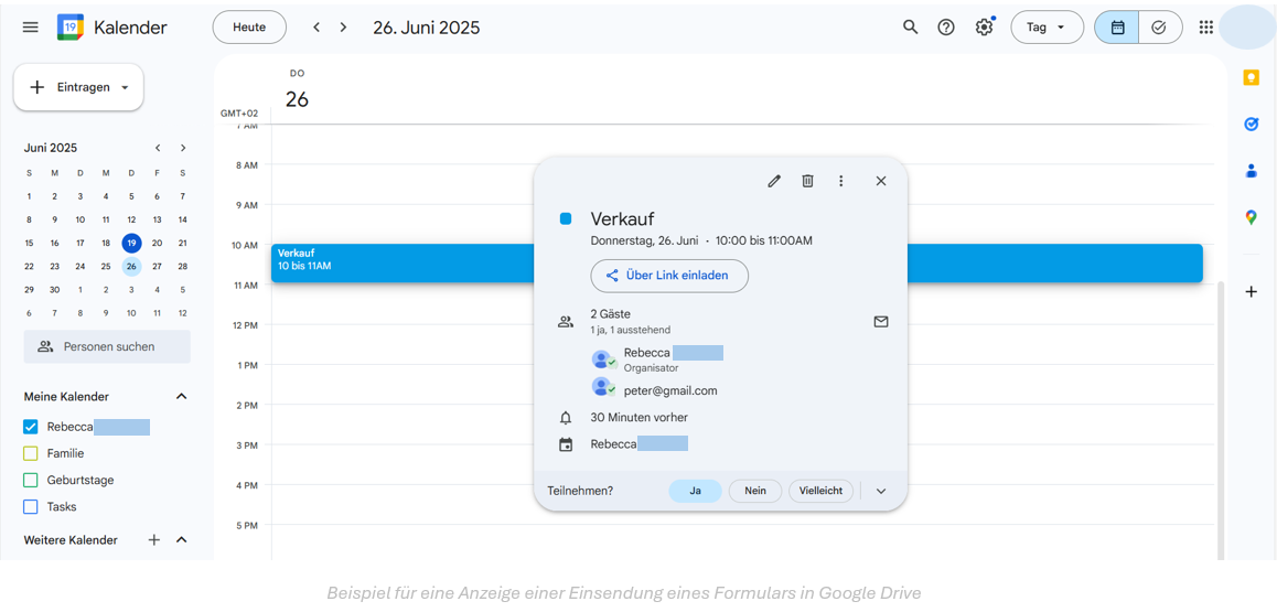 Das Tolle an unserer Google Kalender-Integration ist, dass sie das Planen vereinfacht. Sobald Sie die Integration mit Ihrem Formular verbinden, kann ein Befragter einfach einen Tag und eine Uhrzeit auswählen, die zu seinem Plan passen, auf Absenden drücken, und sein Termin wird automatisch in Ihren Kalender eingetragen.