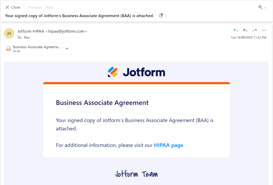Sie können die Seite nun schließen und auf die Kopie der BAA per E-Mail warten. Die E-Mail sieht wie das folgende Bild aus (Outlook-Schnittstelle):
