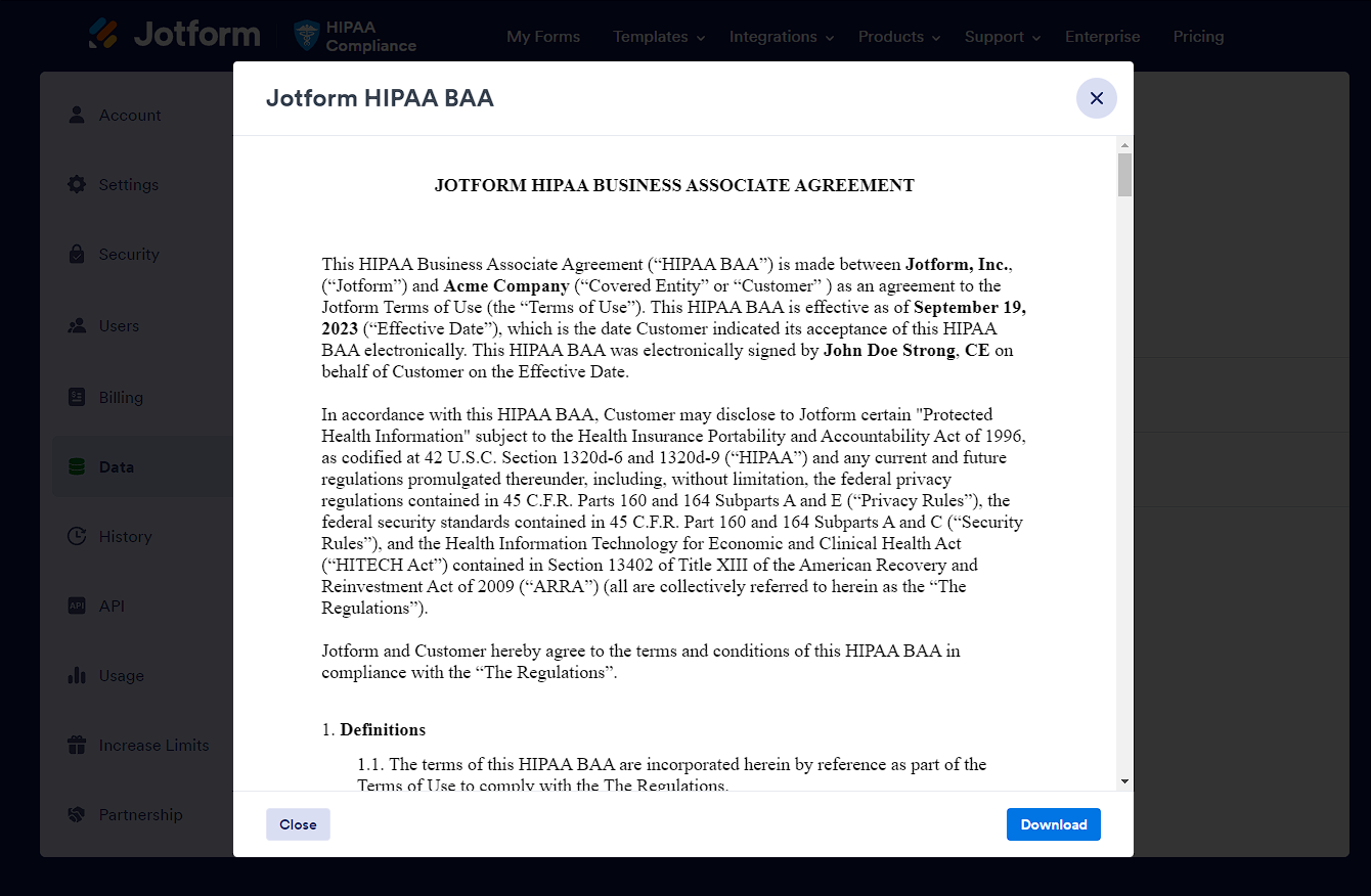 Herzlichen Glückwunsch! Ihr Konto, Ihre Formulare und Ihre Daten sind jetzt für die Einhaltung des HIPAA aktiviert. Das Abzeichen für die HIPAA-Compliance wird automatisch zu Ihrem Konto und Ihren Formularen hinzugefügt.