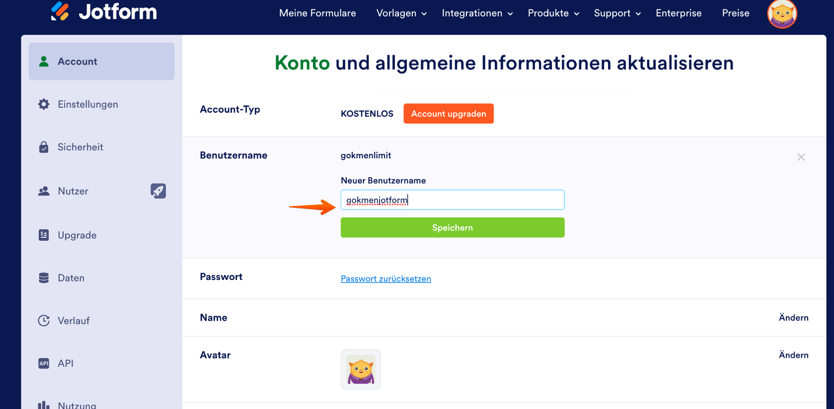 Wenn Sie sich bei Jotform anmelden, müssen Sie lediglich Ihre E-Mail-Adresse angeben. Jotform erstellt automatisch einen Benutzernamen für Sie. Wenn Sie Ihren Benutzernamen ändern möchten, befolgen Sie bitte die unten aufgeführten Schritte.