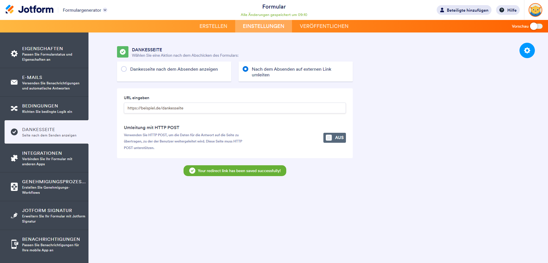 Nach dem Absenden eines Eintrags leitet das Formular den Benutzer an die angegebene URL weiter. Diese Option ist praktisch, wenn Sie möchten, dass Ihre Benutzer nach dem Absenden eines Formulars auf einer bestimmten Seite landen.