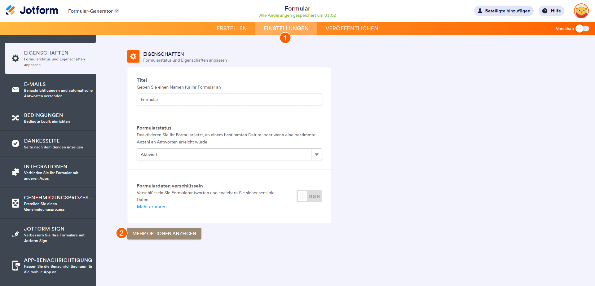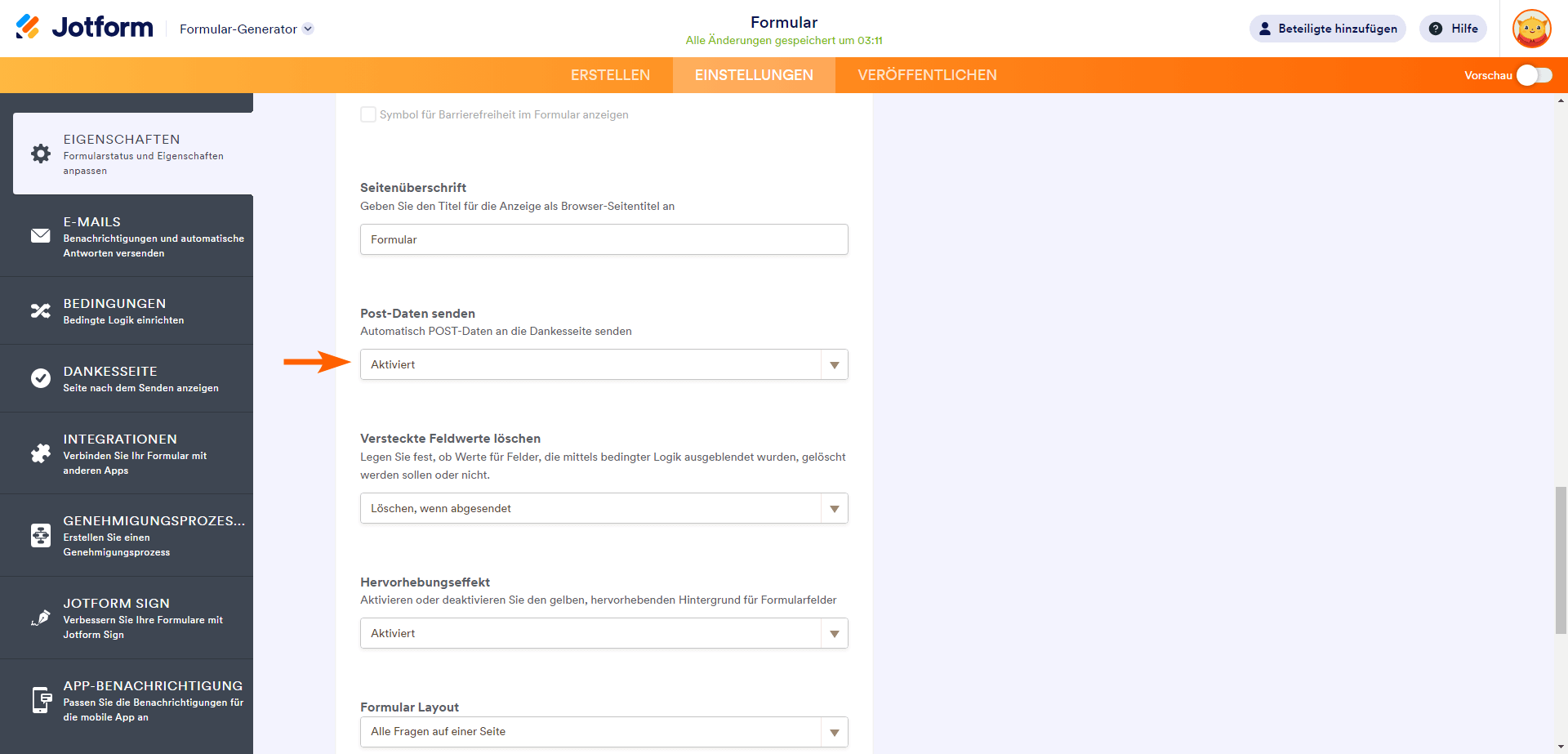 - Gehen Sie im Formular-Generator oben auf Einstellungen.