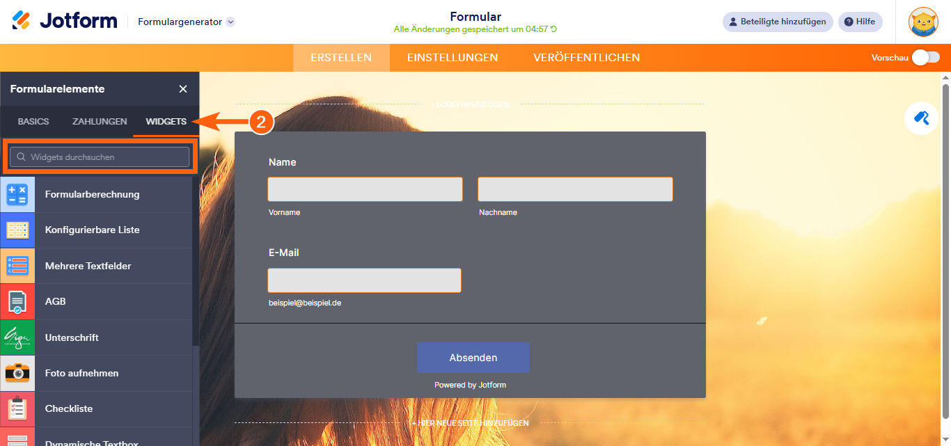 - Klicken Sie anschließend im Menü Formularelemente auf den Reiter Widgets, um nach dem gewünschten Widget zu suchen.