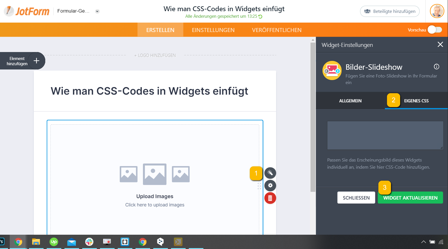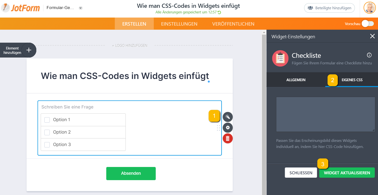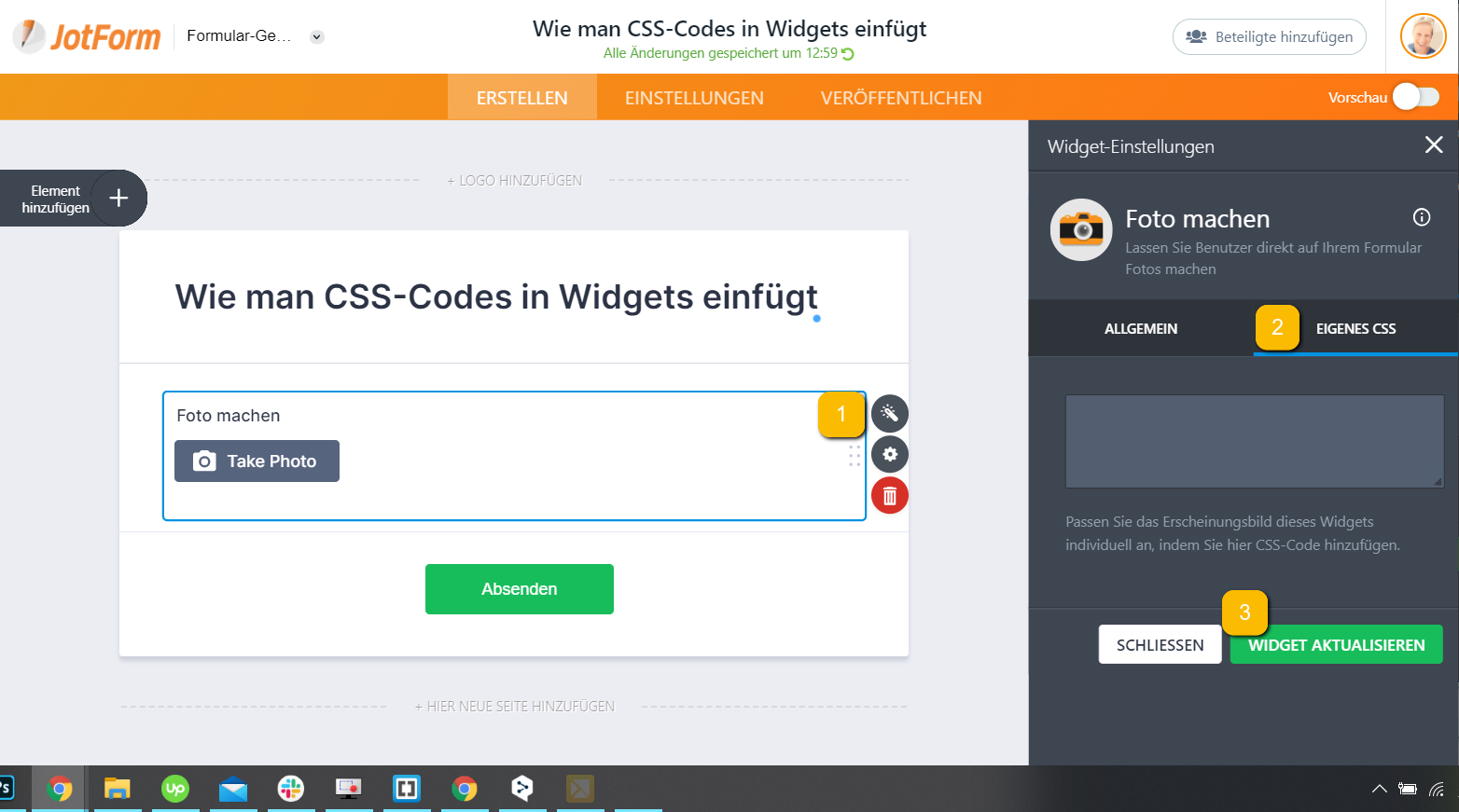 Im Formular-Generator von Jotform können Sie benutzerdefinierte CSS-Codes einfügen, um Ihr Formular individuell zu gestalten. Dasselbe können Sie auch mit Widgets machen.