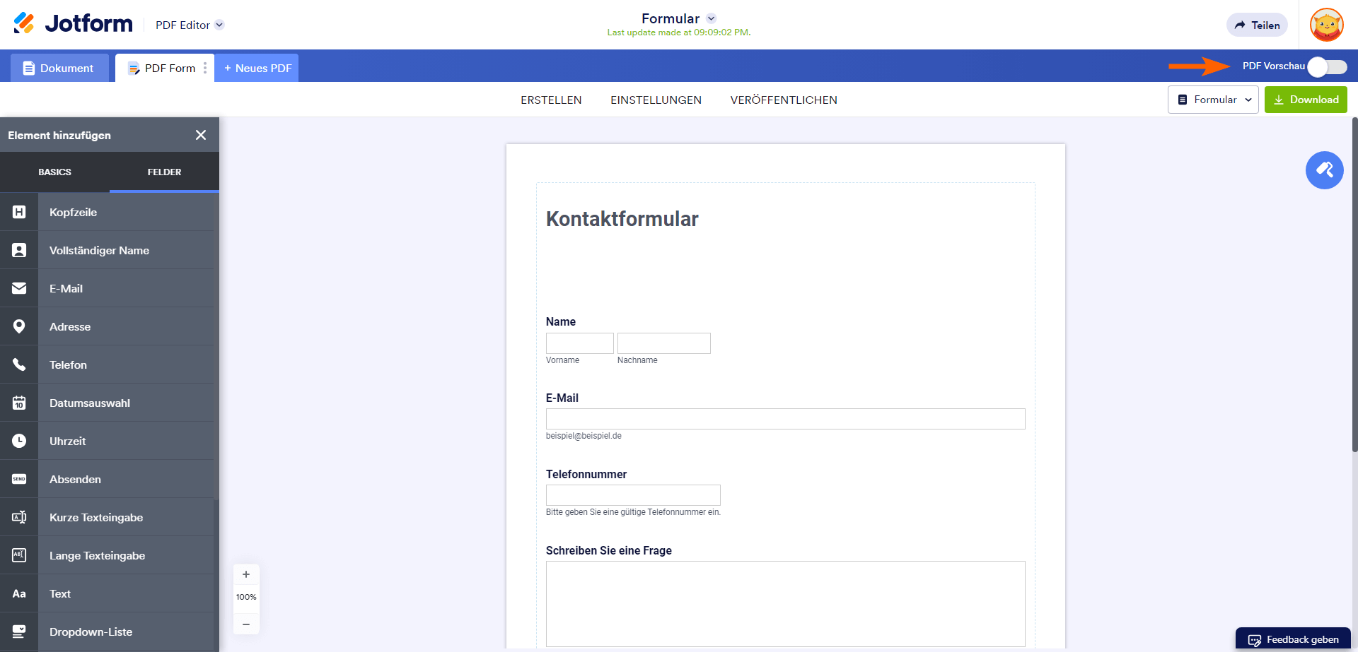 Sobald Sie mit der Erstellung des PDF-Formulars fertig sind, können Sie auf den Button Download in der oberen rechten Ecke klicken, um das PDF-Formular schnell zu erhalten.