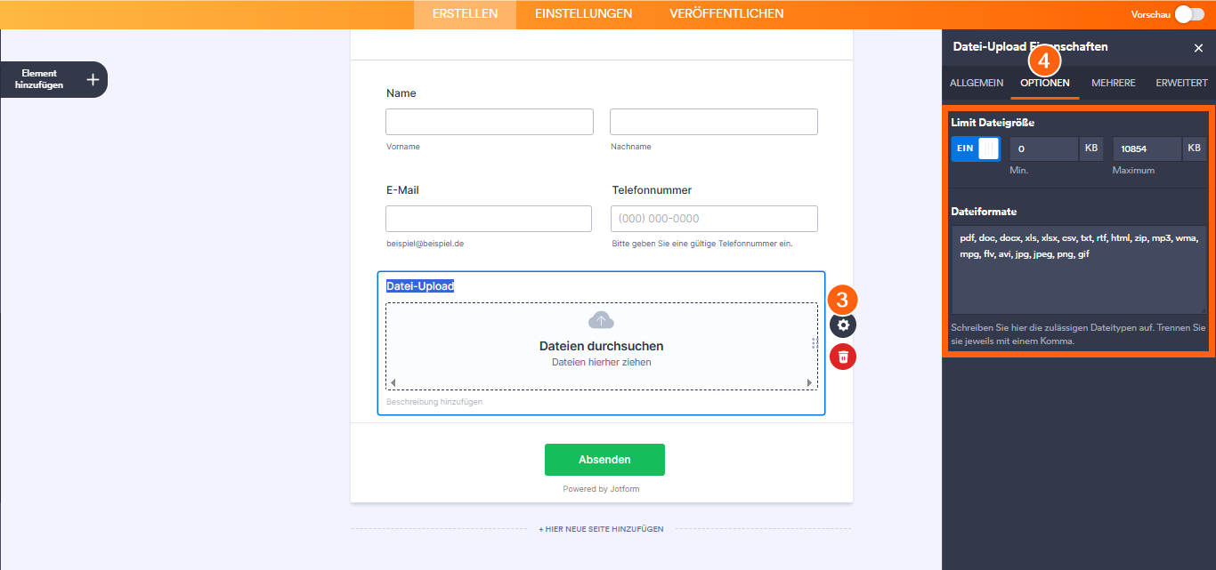 - Klicken Sie anschließend rechts neben dem Feld Datei-Upload auf das Zahnradsymbol.