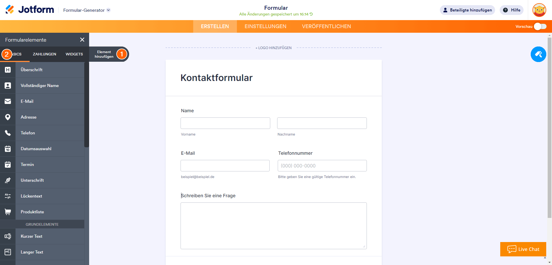 Fragen Sie nach dem Namen und der E-Mail-Adresse des Besuchers, damit Sie Ihre Formularantworten nachverfolgen und mit den Besuchern Rücksprache halten können. Klicken Sie auf Element hinzufügen auf der linken Seite des Formular-Generators. Alle Standardformularfelder erscheinen unter der Registerkarte Basics.